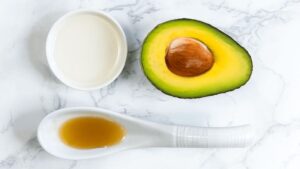 – Bạn lấy ¼ quả bơ nghiền nhuyễn trộn đều với 1 thìa dầu dừa nguyên chất được hỗn hợp.